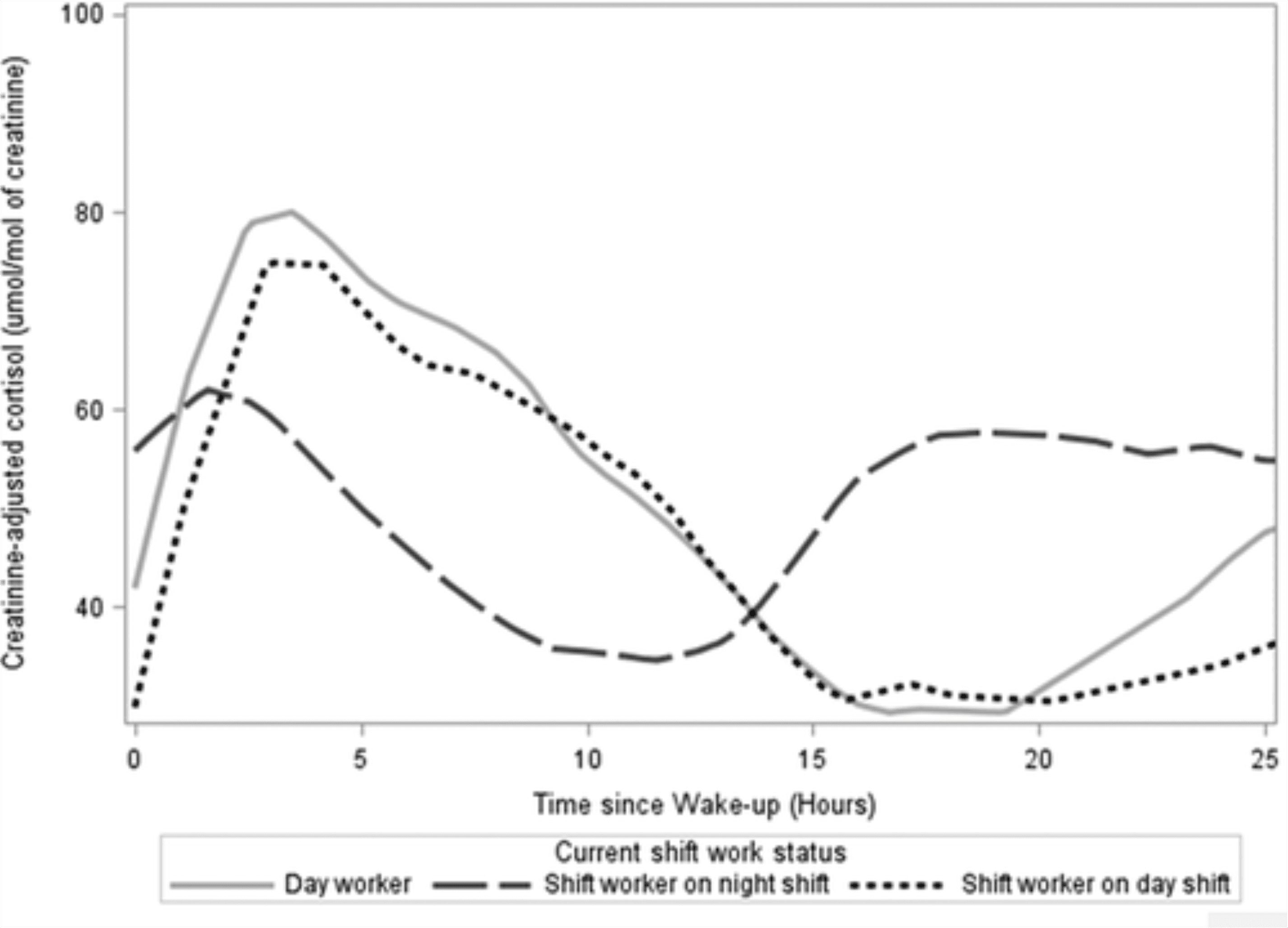 We know that real shift workers working nights out in the real world tend to have flatter, shifted cortisol rhythms with lower highs and higher lows: