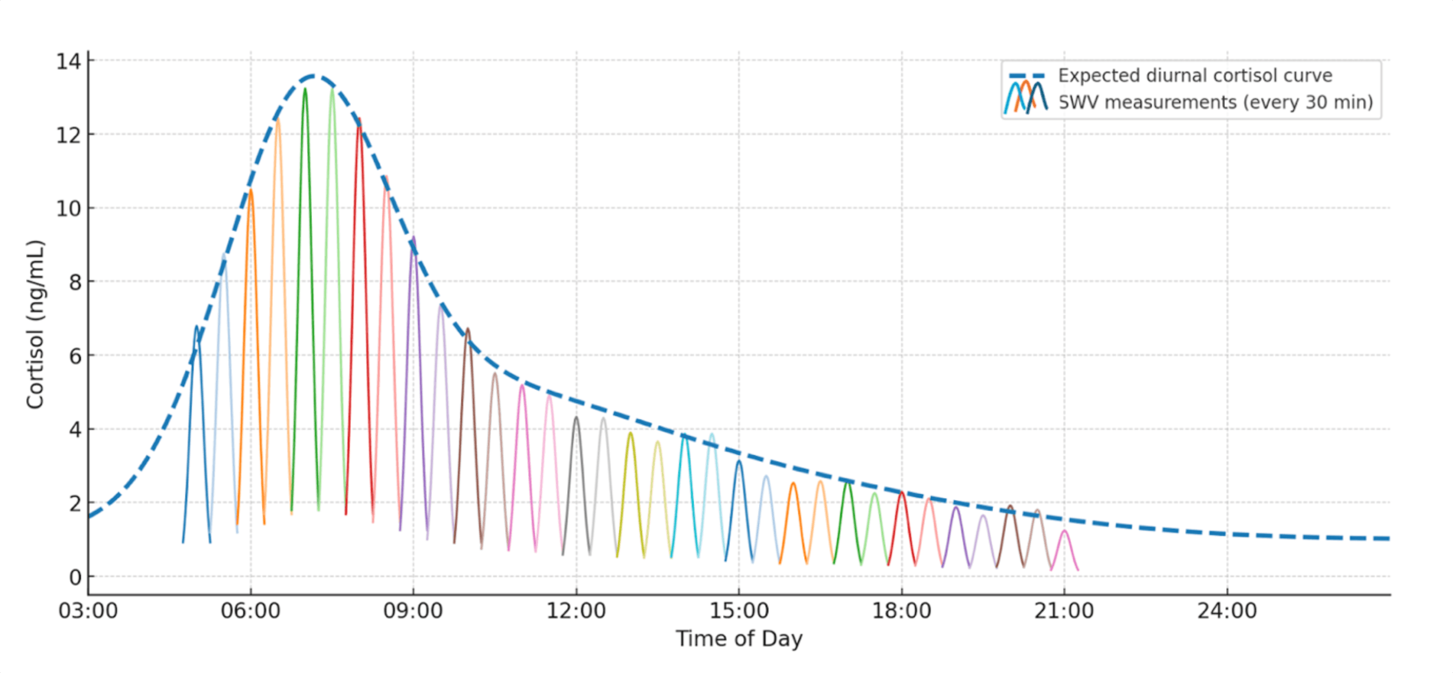 When cortisol binds to its aptamer, the sensor shifts its electrical signal. Those shifts—tiny, fast, constant, become the curve. Your curve. A direct look at how your rhythm rises, falls, and responds to life as it unfolds.